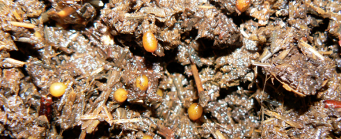 When harvesting castings or worms I have seen more “love knots” and cocoons than ever.  The picture above is of two red wigglers exchanging seminal fluid.  In ideal conditions red worms can produce a cocoon or egg sac every 7 days.  Each egg sac (depending on conditions) can hatch 4-20+ tiny red worms.